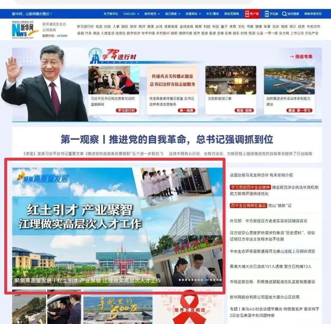 【编者语】12月1日,新华网以“红土引才 产业聚智 江理做实高层次人才工作”为题报道江西理工大学人才工作,并在新华网首页大图展示。一起来看具体报道——