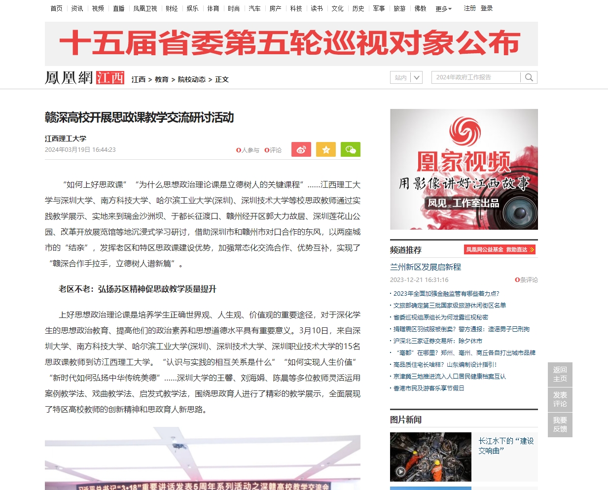 《讲好思想政治理论课的若干思考》《坚持两个结合 把握思政课要旨》……3月17日,江西理工大学14名思政课教师一行回访深圳大学,与深圳相关高校举行了教学交流研讨会。生动的教学展示,精心的教学设计、良好的教学呈现、一场场主旨报告会精彩纷呈,“为什么思想政治理论课是立德树人的关键课程”“思政课创新必须坚持‘两个结合’,思政课改革要注重形式更要注重内容”……一个个问题刨析,充分展现了老区和特区高校教师的青春风采。