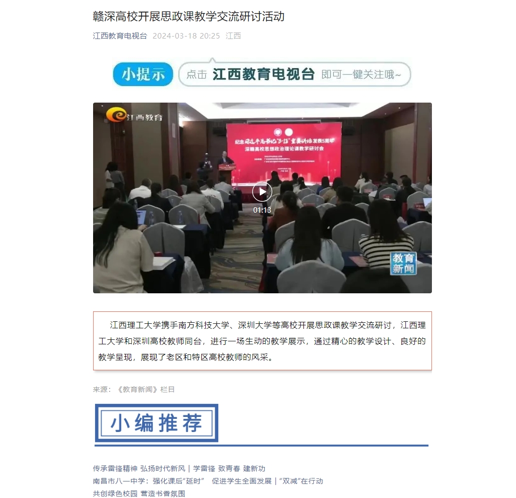 江西理工大学携手南方科技大学、深圳大学等高校开展思政课教学交流研讨,江西理工大学和深圳高校教师同台,进行一场生动的教学展示,通过精心的教学设计、良好的教学呈现,展现了老区和特区高校教师的风采。