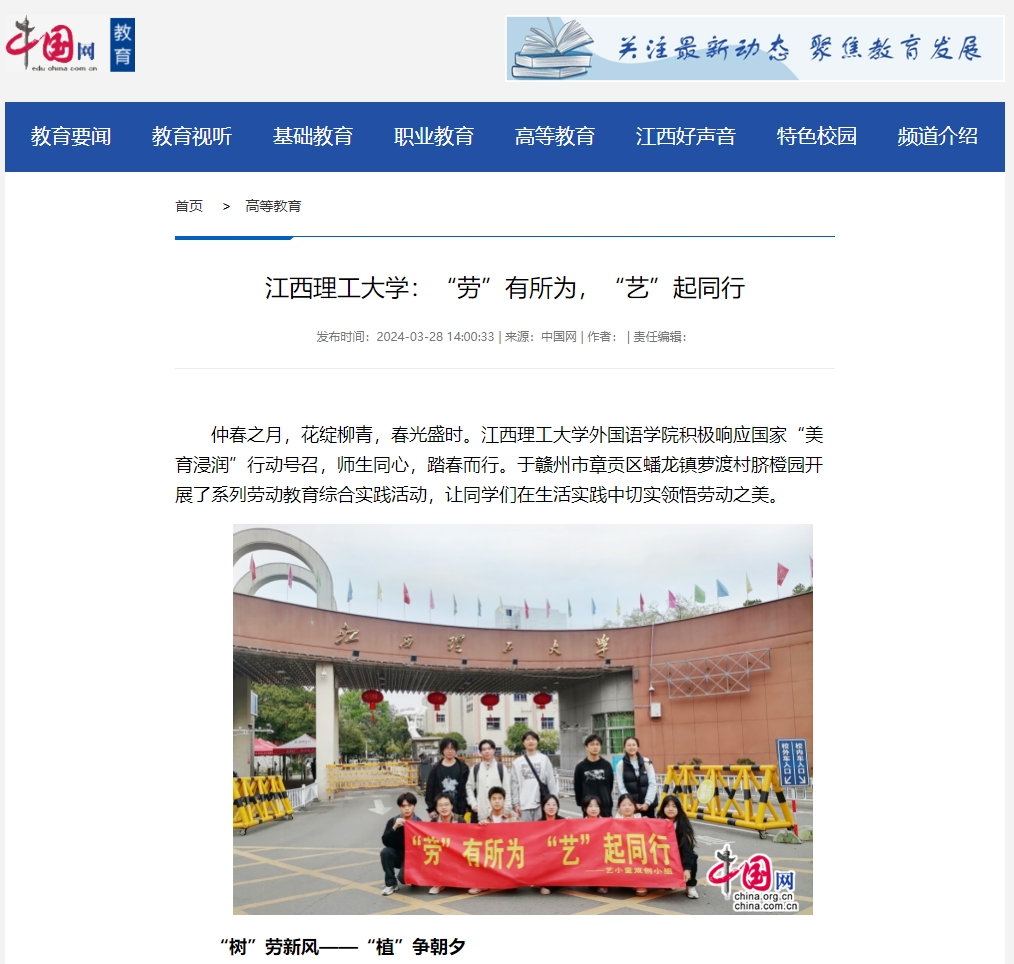 仲春之月,花绽柳青,春光盛时。江西理工大学外国语学院积极响应国家“美育浸润”行动号召,师生同心,踏春而行。于赣州市章贡区蟠龙镇萝渡村脐橙园开展了系列劳动教育综合实践活动,让同学们在生活实践中切实领悟劳动之美。