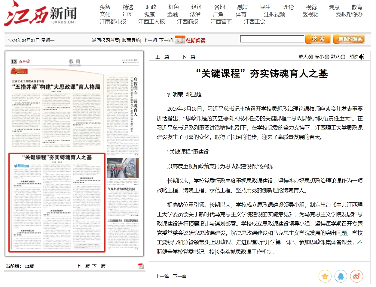 《江西日报》:“关键课程”夯实铸魂育人之基