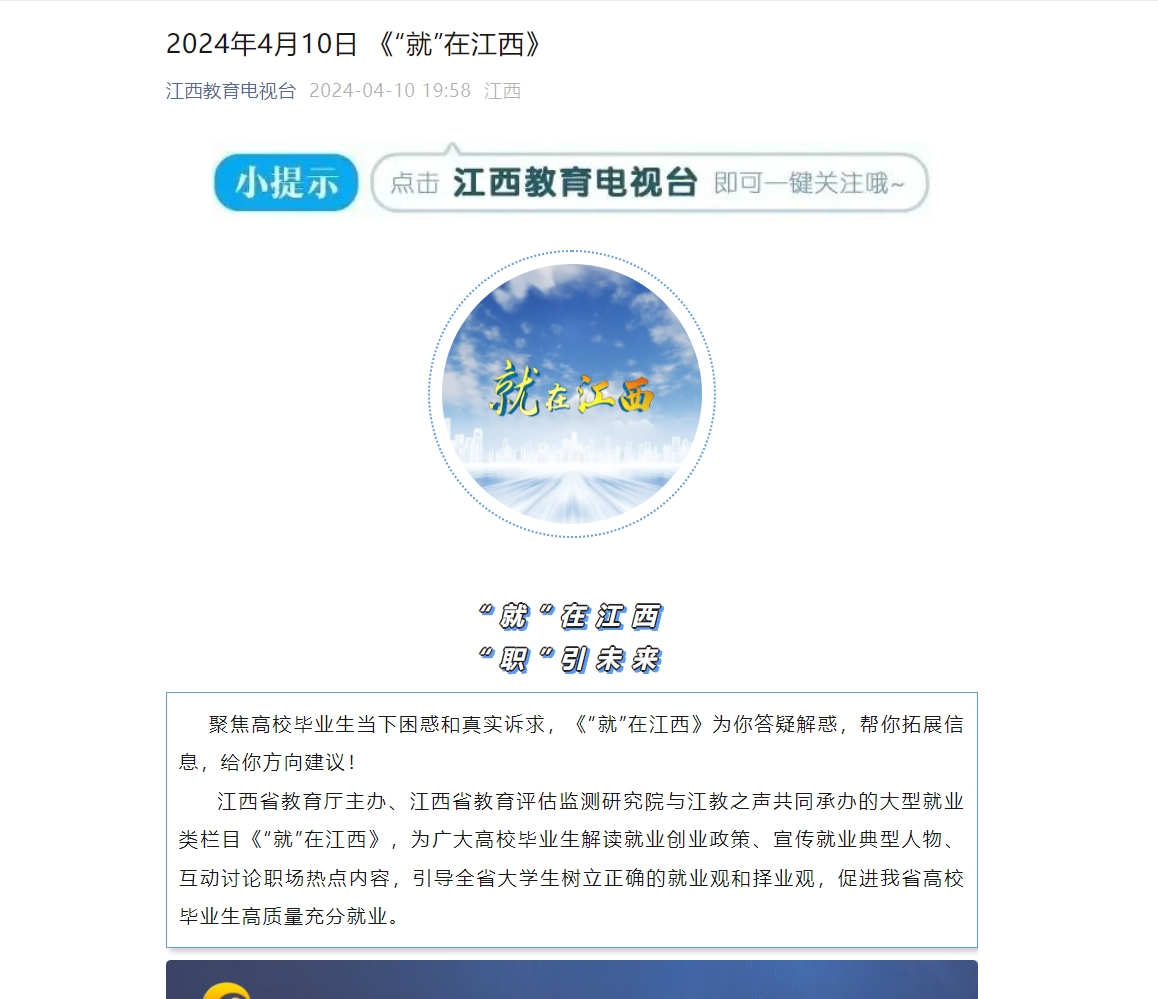 江西省教育厅主办、江西省教育评估监测研究院与江教之声共同承办的大型就业类栏目《“就”在江西》,为广大高校毕业生解读就业创业政策、宣传就业典型人物、互动讨论职场热点内容,引导全省大学生树立正确的就业观和择业观,促进我省高校毕业生高质量充分就业。