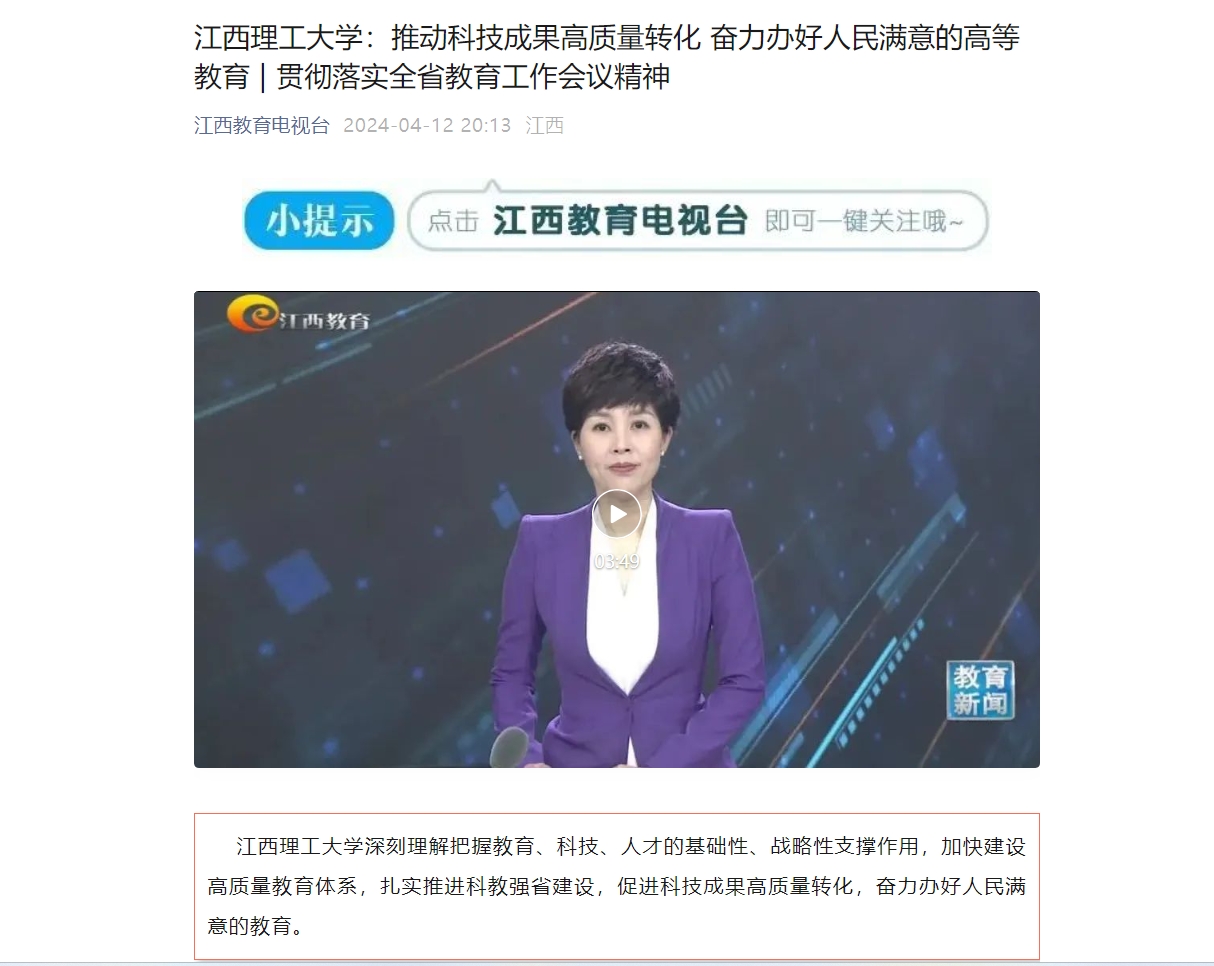 《江西教育电视台》:江西理工大学:推动科技成果高质量转化 奋力办好人民满意的高等教育 | 贯彻落实全省教育工作会议精神
