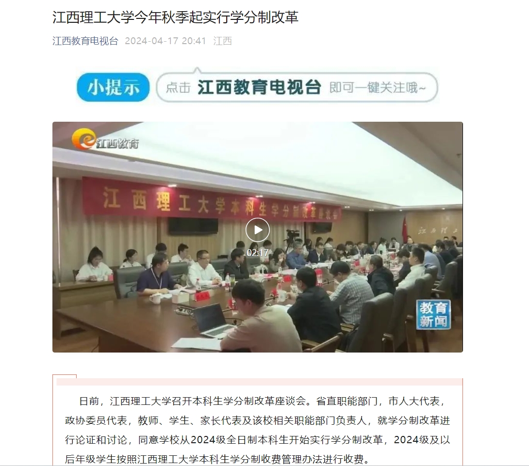 日前,江西理工大学召开本科生学分制改革座谈会。省直职能部门,市人大代表,政协委员代表,教师、学生、家长代表及该校相关职能部门负责人,就学分制改革进行论证和讨论,同意学校从2024级全日制本科生开始实行学分制改革,2024级及以后年级学生按照江西理工大学本科生学分制收费管理办法进行收费。