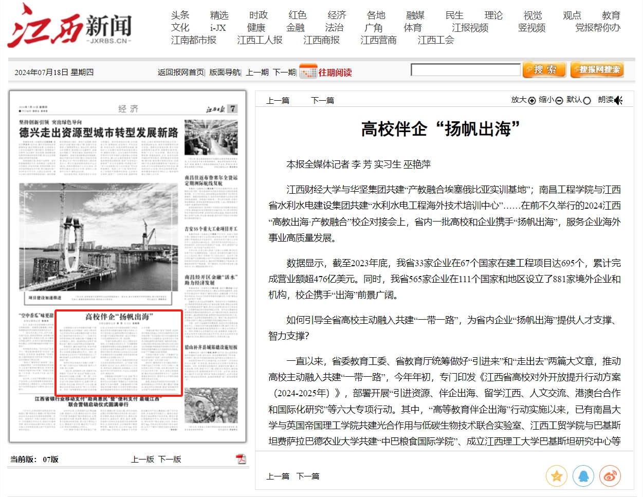 一直以来,省委教育工委、省教育厅统筹做好“引进来”和“走出去”两篇大文章,推动高校主动融入共建“一带一路”,今年年初,专门印发《江西省高校对外开放提升行动方案(2024-2025年)》,部署开展“引进资源、伴企出海、留学江西、人文交流、港澳台合作和国际化研究”等六大专项行动。其中,“高等教育伴企出海”行动实施以来,已有南昌大学与英国帝国理工学院共建光合作用与低碳生物技术联合实验室、江西工贸学院与巴基斯坦费萨拉巴德农业大学共建“中巴粮食国际学院”、成立江西理工大学巴基斯坦研究中心等一批成果。