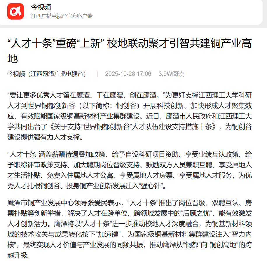 “要让更多优秀人才留在鹰潭、干在鹰潭、创在鹰潭。”为更好支撑江西理工大学科研人才到世界铜都创新谷(以下简称:铜创谷)开展科技创新、加快形成人才聚集效应、有效赋能国家级铜基新材料产业集群建设。近日,鹰潭市人民政府和江西理工大学共同出台了《关于支持“世界铜都创新谷”人才队伍建设支持措施十条》,为铜创谷建设提供强有力人才支撑。