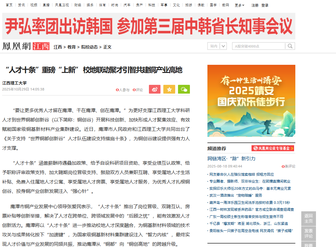“要让更多优秀人才留在鹰潭、干在鹰潭、创在鹰潭。”为更好支撑江西理工大学科研人才到世界铜都创新谷(以下简称:铜创谷)开展科技创新、加快形成人才聚集效应、有效赋能国家级铜基新材料产业集群建设。近日,鹰潭市人民政府和江西理工大学共同出台了《关于支持“世界铜都创新谷”人才队伍建设支持措施十条》,为铜创谷建设提供强有力人才支撑。