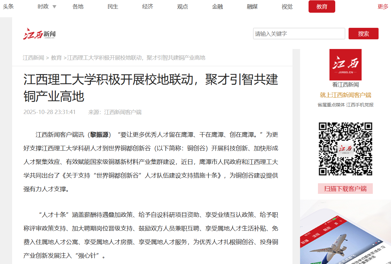 江西新闻客户端讯(黎振源)“要让更多优秀人才留在鹰潭、干在鹰潭、创在鹰潭。”为更好支撑江西理工大学科研人才到世界铜都创新谷(以下简称:铜创谷)开展科技创新、加快形成人才聚集效应、有效赋能国家级铜基新材料产业集群建设,近日,鹰潭市人民政府和江西理工大学共同出台了《关于支持“世界铜都创新谷”人才队伍建设支持措施十条》,为铜创谷建设提供强有力人才支撑。