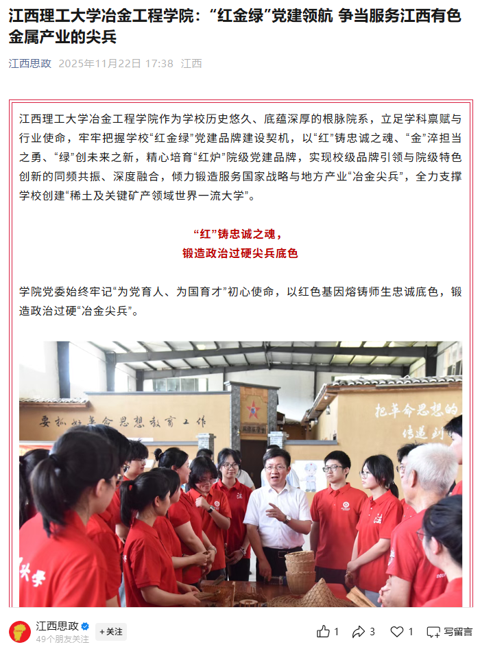 【江西思政微信公众号】:江西理工大学冶金工程学院:“红金绿”党建领航 争当服务江西有色金属产业的尖兵