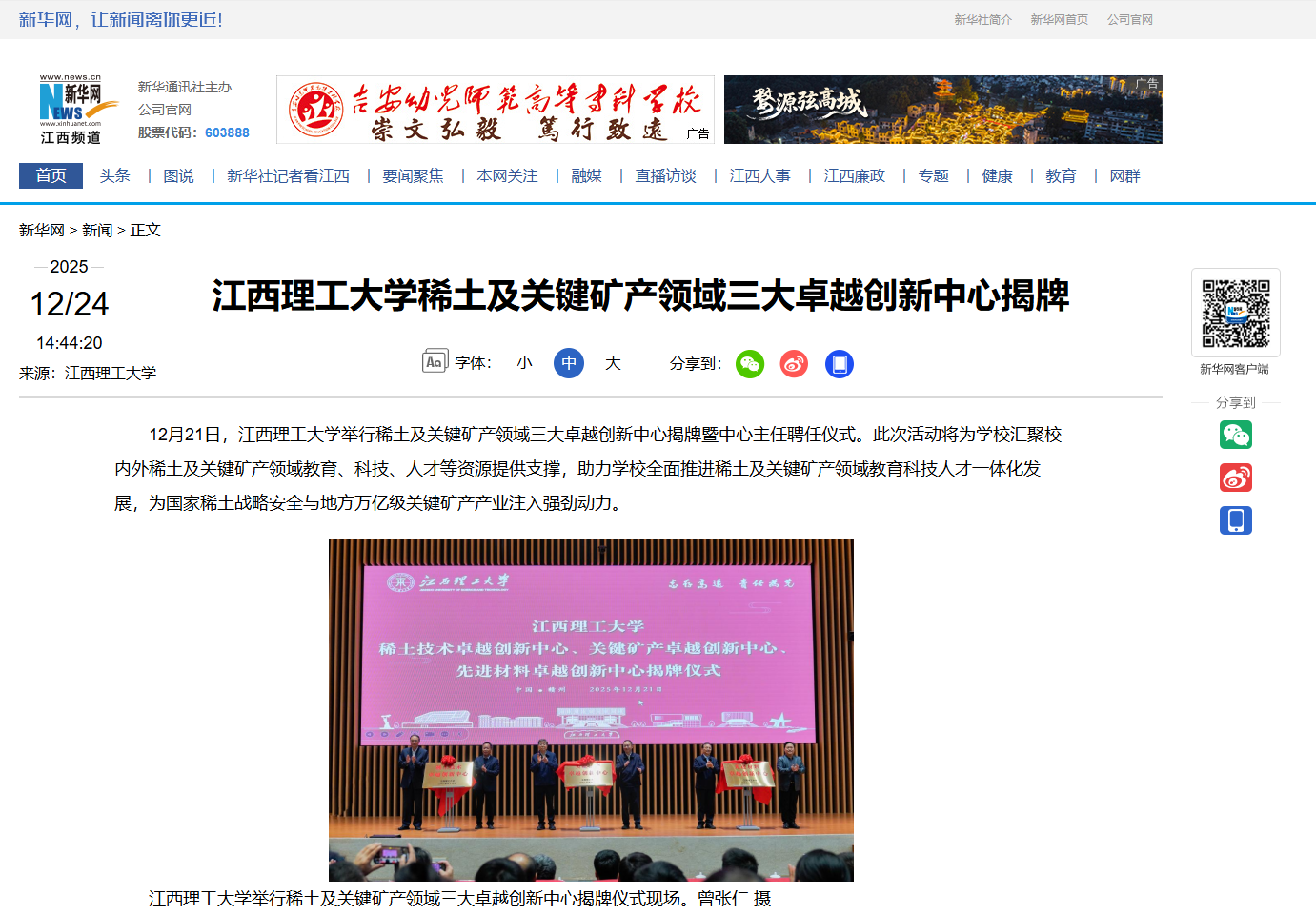 《新华网》:江西理工大学稀土及关键矿产领域三大卓越创新中心揭牌