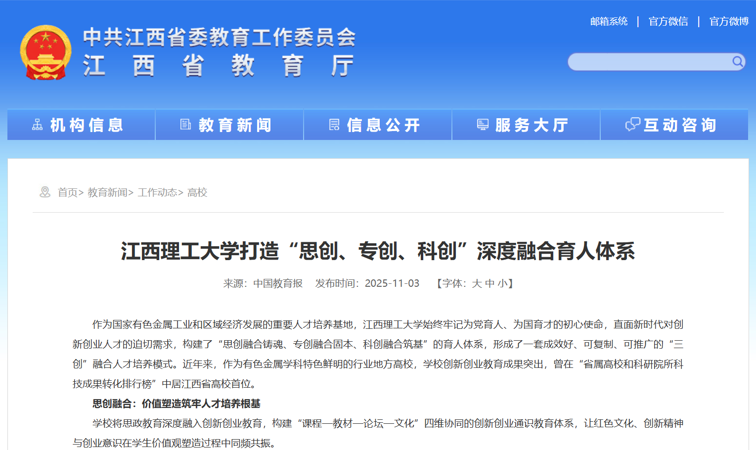 江西理工大学用三个关键词概括了“三创”融合的内在逻辑:学校通过“思创”为魂激发创新创业内生动力,“专创为本”赋能创新创业能力培养,“科创为基”构建科技成果转化服务创业实践的基础,形成“价值塑造—能力培养—实践应用”的创新创业育人范式。“创新是引领发展的第一动力,人才是支撑创新的第一资源。”面向未来,江西理工大学将继续深化创新创业教育模式改革,为服务国家战略需求和区域经济社会发展培养更多“敢闯会创”的高素质创新人才。