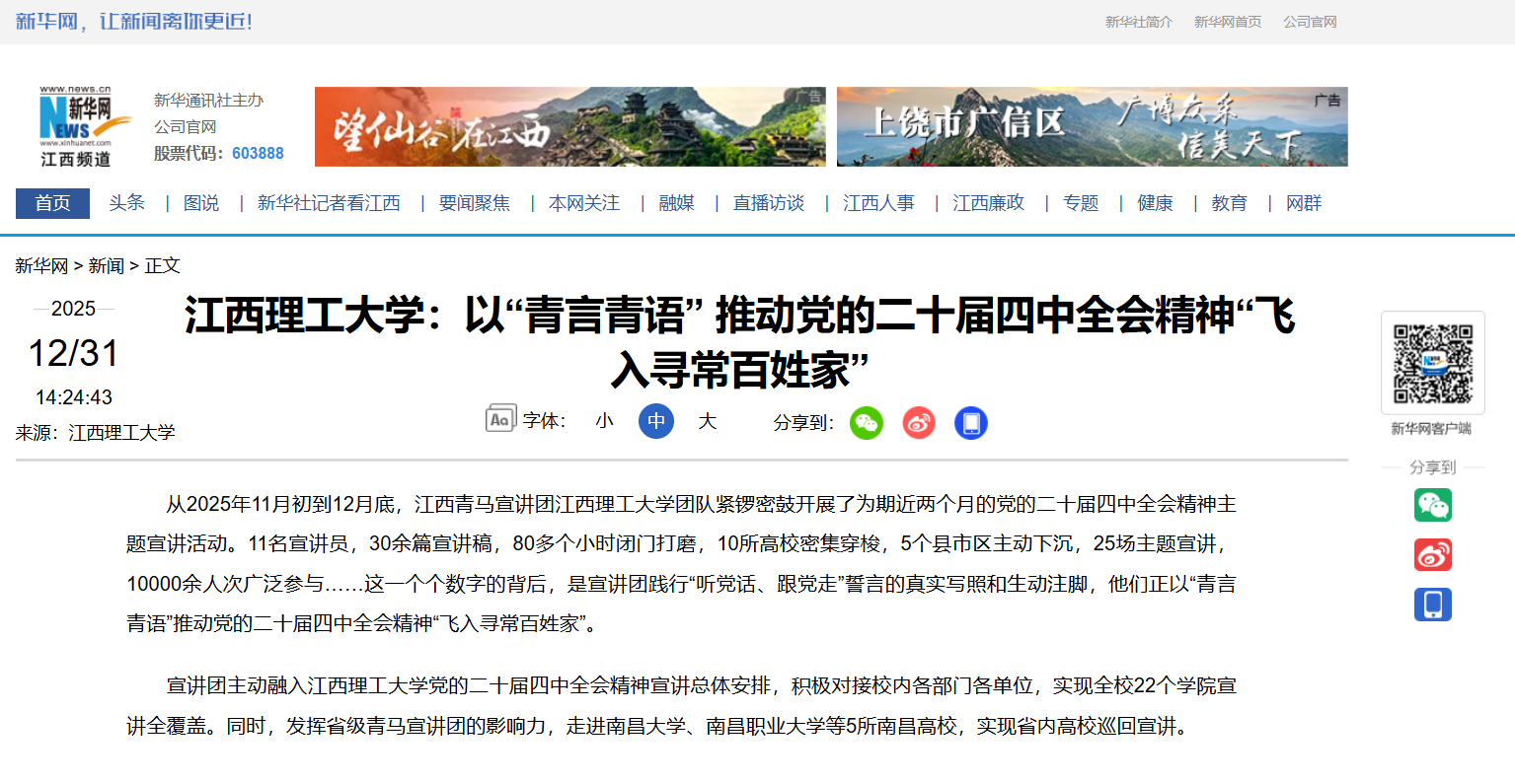 《新华网》:江西理工大学:以“青言青语” 推动党的二十届四中全会精神“飞入寻常百姓家”