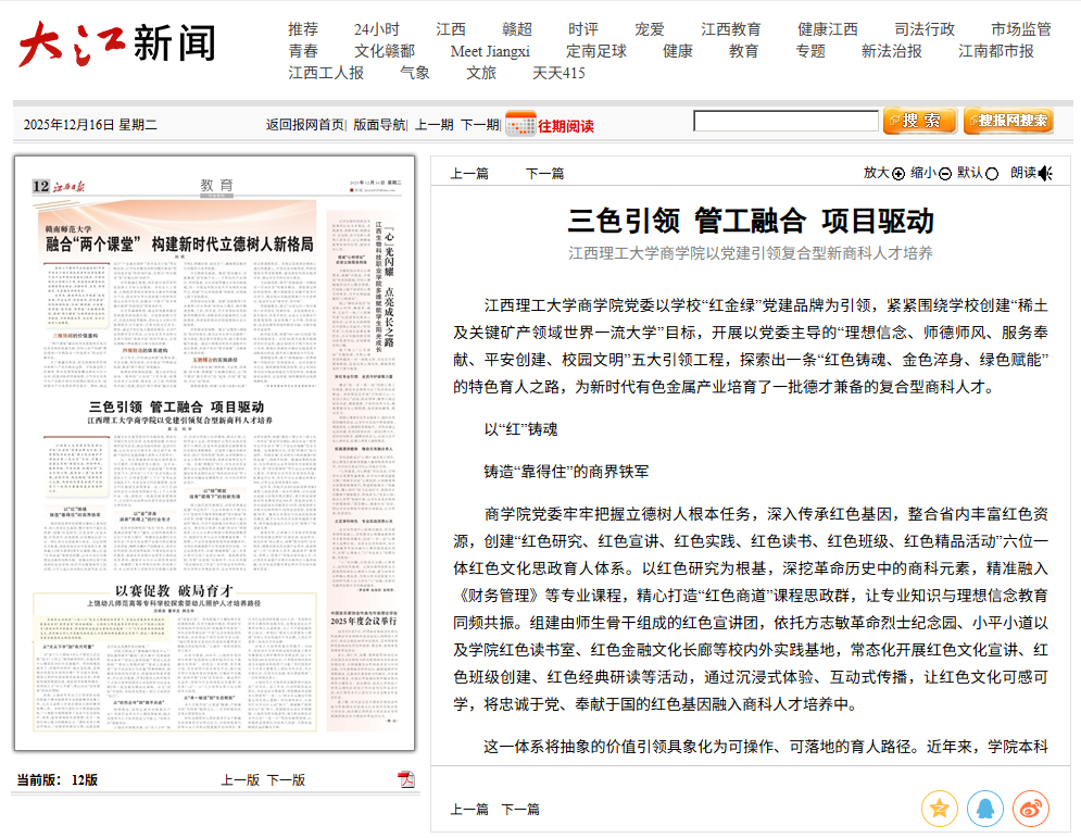 《江西日报》:三色引领 管工融合 项目驱动 江西理工大学商学院以党建引领复合型新商科人才培养