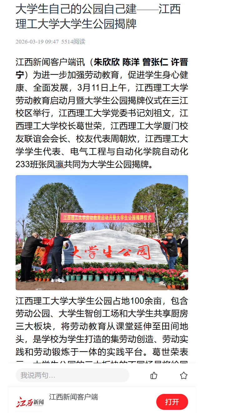 江西新闻客户端讯(朱欣欣 陈洋 曾张仁 许晋宁)为进一步加强劳动教育,促进学生身心健康、全面发展,3月11日上午,江西理工大学劳动教育启动月暨大学生公园揭牌仪式在三江校区举行,江西理工大学党委书记刘祖文,江西理工大学校长葛世荣,江西理工大学厦门校友联谊会会长、校友代表周朝炊,江西理工大学学生代表、电气工程与自动化学院自动化233班张凤瀛共同为大学生公园揭牌。