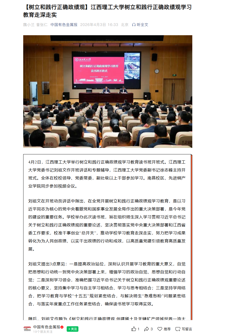 4月2日,江西理工大学举行树立和践行正确政绩观学习教育读书班开班式。江西理工大学党委书记刘祖文作开班讲话和专题辅导,江西理工大学党委副书记徐志峰主持开班式。全体在校校领导、党委常委,副处级以上干部参加学习。南昌校区、先进铜产业学院同步参加视频会议。