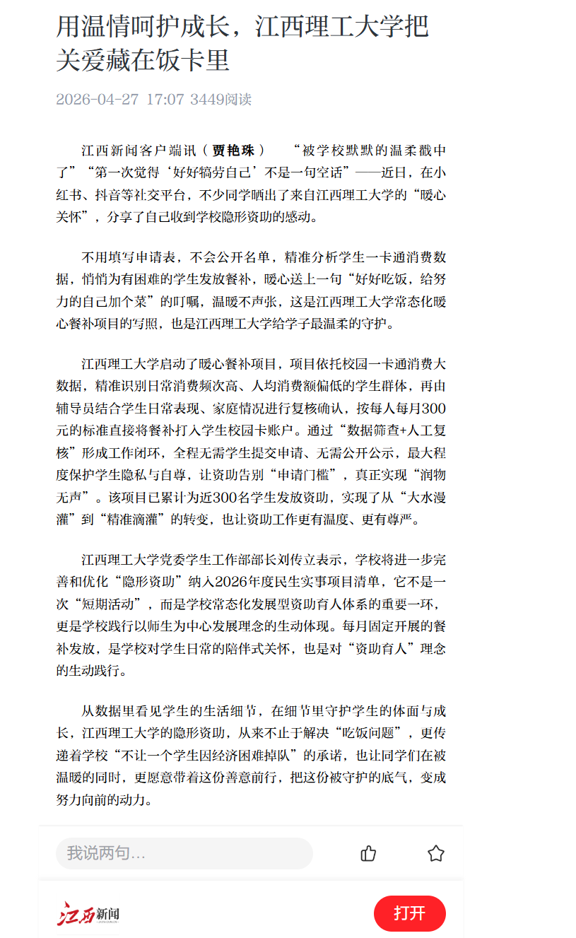 江西理工大学党委学生工作部部长刘传立表示,学校将进一步完善和优化“隐形资助”纳入2026年度民生实事项目清单,它不是一次“短期活动”,而是学校常态化发展型资助育人体系的重要一环,更是学校践行以师生为中心发展理念的生动体现。每月固定开展的餐补发放,是学校对学生日常的陪伴式关怀,也是对“资助育人”理念的生动践行。